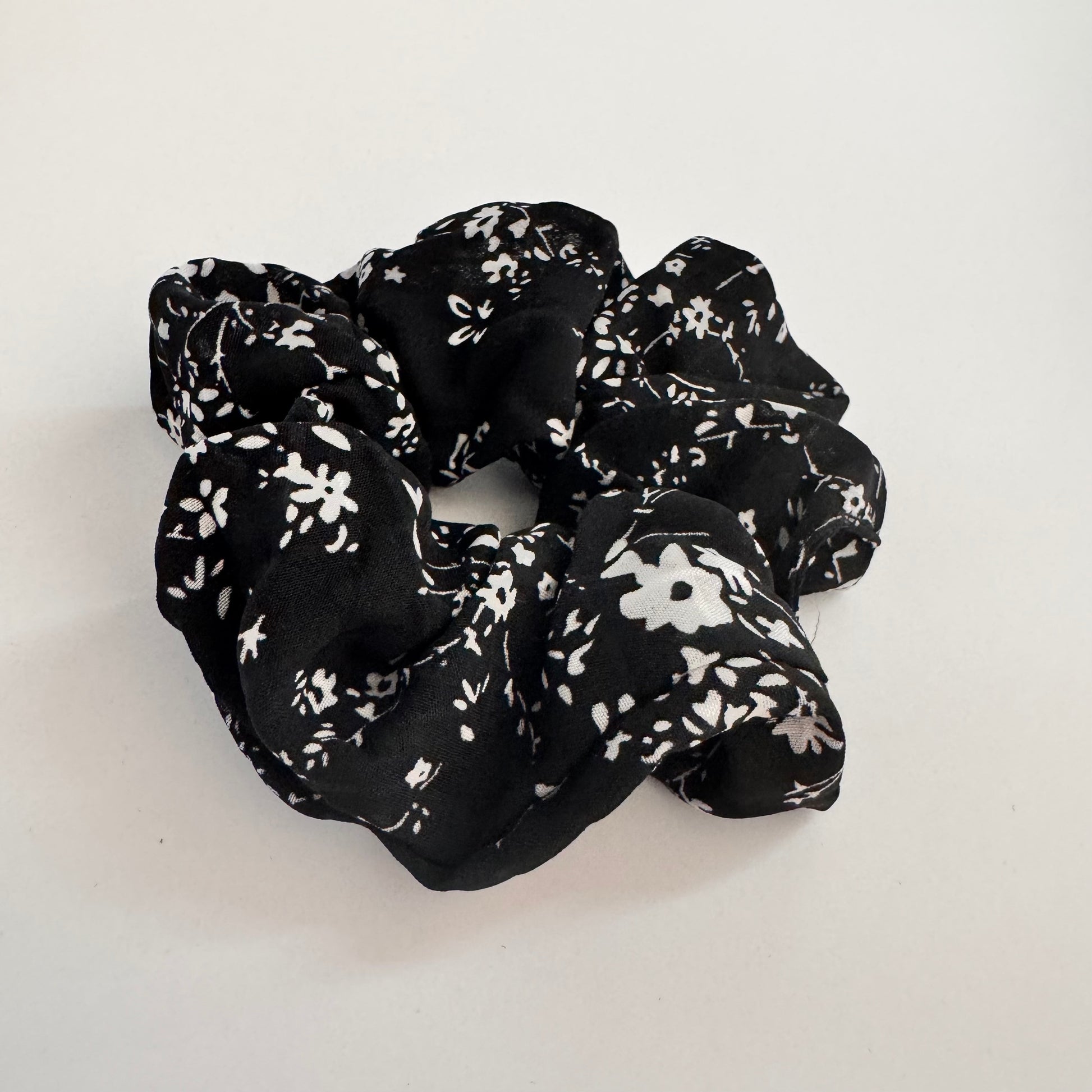 Noir & Blanc features two scrunchies per pack that includes a bold black and white floral pattern that stands out with its striking contrast. The design is both intricate and graphic, adding a unique touch to your hair. This scrunchie brings a fresh, clean look with its eye-catching floral details.